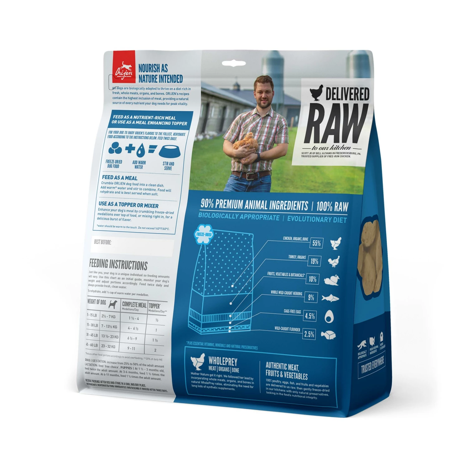 Freeze-dried animal ingredients provide your dog with a rich, concentrated source of protein and nutrients, just like a raw diet – but in a convenient, dry form. ORIJEN® Original Freeze-Dried Food is loaded with free-run chicken and turkey, wild-caught herring and flounder, and cage-free eggs. By using the most nutrient-dense, succulent parts of the prey, ORIJEN® foods provide your dog with a Biologically Appropriate diet, with 40% protein, giving them everything they need so they can stay thrive.