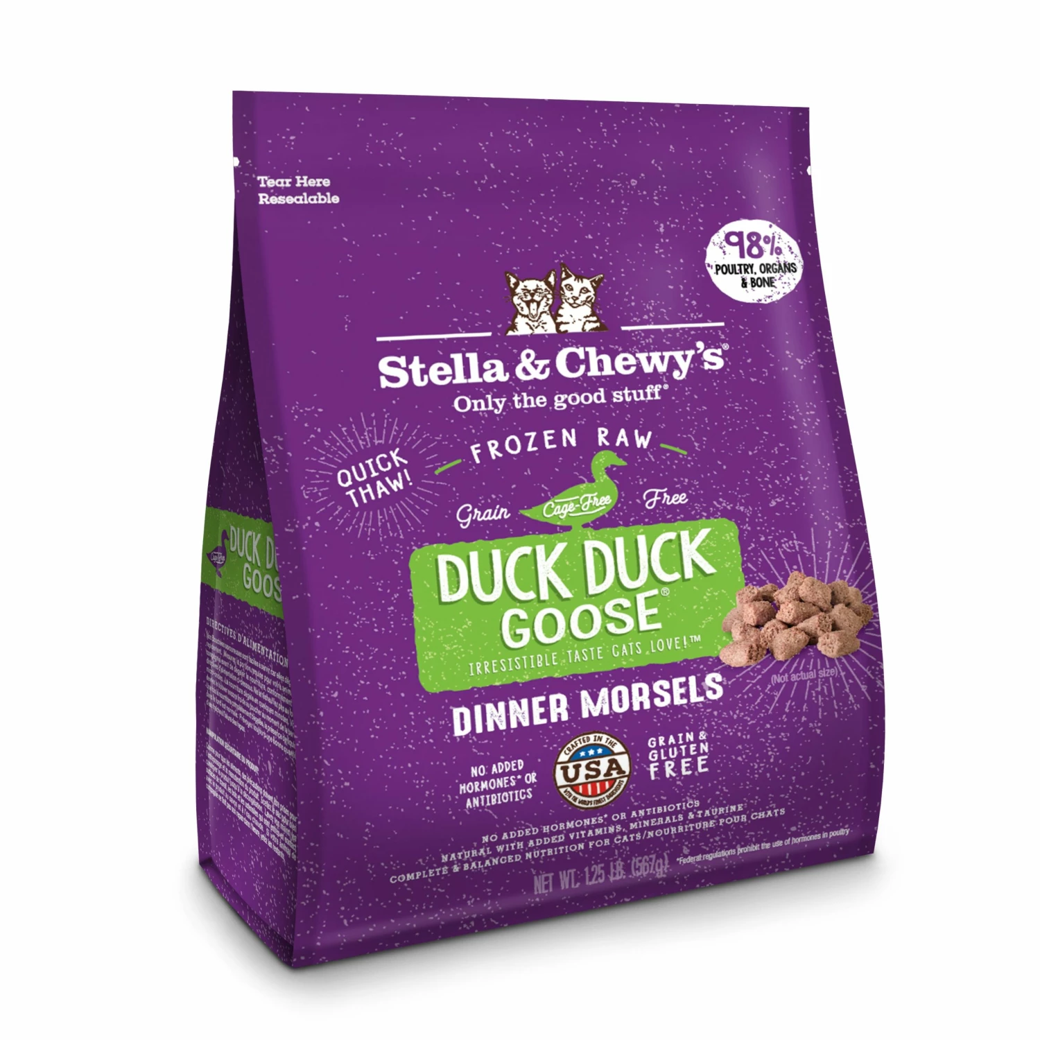 These Duck Duck Goose frozen raw, dinner morsels (1.25 lb offering) are formulated to mirror a cat’s ancestral diet, one with no grains or gluten. There has never been an easier way to feed a biologically appropriate raw food diet! Our frozen raw dinner morsels minimize the time needed to thaw before serving. Quick thaw and serve, raw feeding made easy!